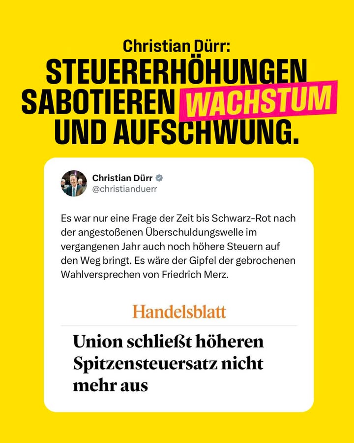 Christian Dürr: „Wer anpackt, Verantwortung übernimmt und Wachstum ermöglicht, hält unsere Wirtschaft am Laufen. Politik muss den Einsatz unterstützen und nicht erschweren. Während das Leben gerade für viele Menschen immer teurer wird, verliert sich die Koalition immer verantwortungsloser im Sumpf von Umverteilungsphantasien und Steuererhöhungen. Wenn Entlastungen nur über einen höheren Spitzensteuersatz möglich sein sollen, müsste dieser auf deutlich über 50 Prozent steigen. In der aktuellen Krise ist es fahrlässig die vielen Fleißigen, die vom Spitzensteuersatz betroffen sind, zu bestrafen – das sind viele Arbeitnehmer, Freiberufler und Handwerker. Vielmehr noch: Wenn die Union diesen Weg geht, sabotiert sie aktiv Aufschwung und Wachstum. Sich allen Menschen, die ranklotzen, in den Weg zu stellen, ist der falsche Weg – ihnen muss der Weg bereitet werden. Es braucht den Mut zu Reformen, damit Steuern und Lohnnebenkosten sinken, mehr Freiheiten bei Investitionen entstehen und Deutschland wieder wachsen kann.“
