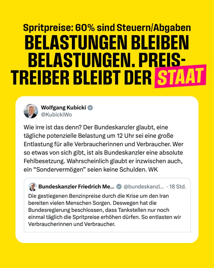 Was Wolfgang Kubicki sagt! Wir brauchen endlich Entlastungen. Schwarz-Rot sollte die Steuern und Abgaben senken, um die Menschen an der Zapfsäule zu entlasten. Ansonsten bleibt der Staat der Hauptprofiteur hoher Spritpreise.